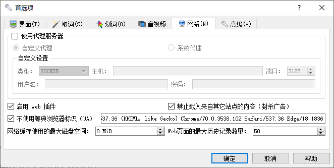 编辑完成点击确定按钮即可。为获得理想的查询效果,还可以在GoldenDict++菜单栏点击编辑>首选项打开网络页面,勾选不使用默认的浏览器标识,并设置UA标识为EdgeChrome等浏览器的,如: