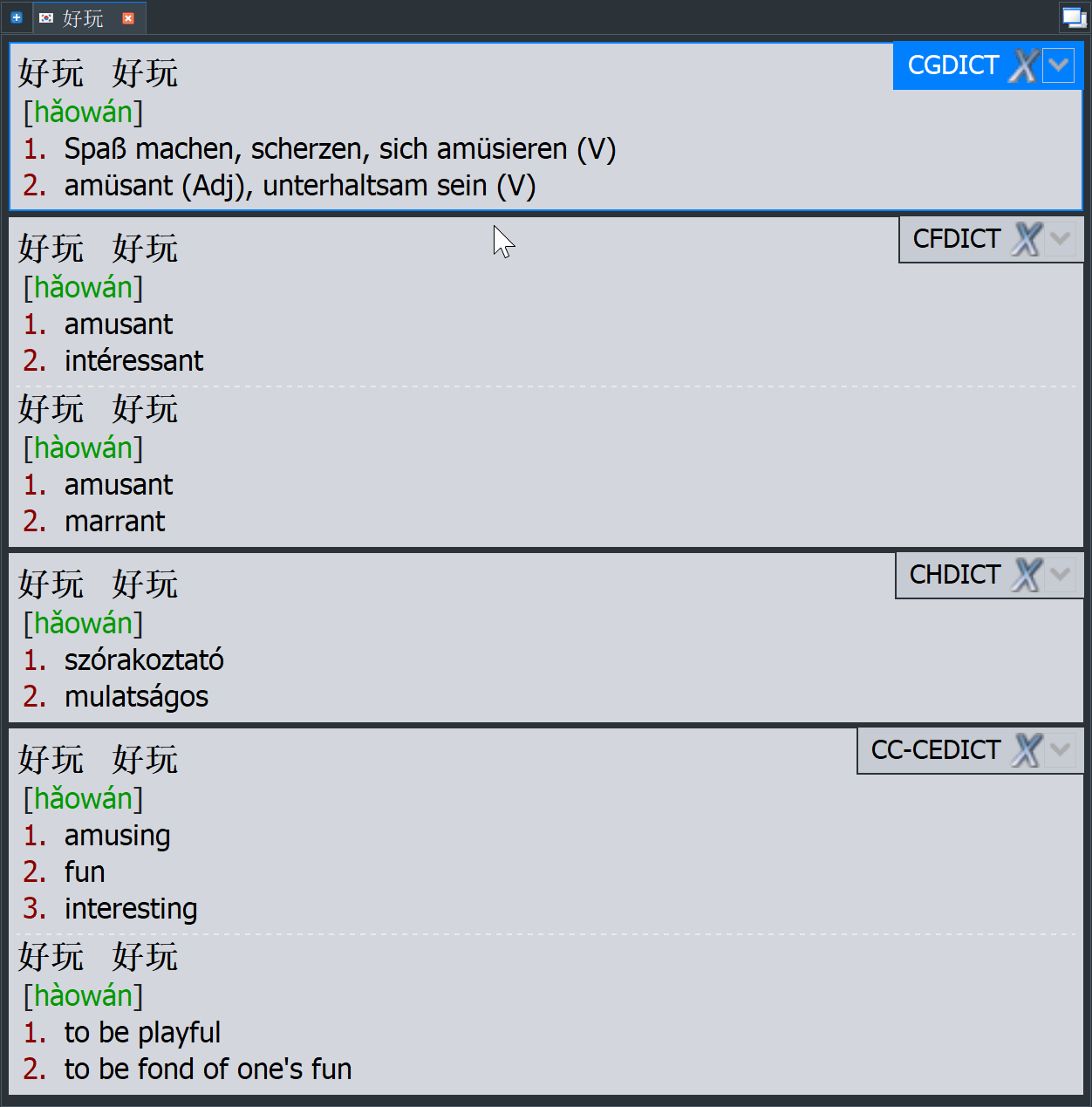 为自学用,应始终坚持以学习为目的 – 寻求并使用适用于个人学习的电子资料应不会有什么争议吧。但奉劝各位寻求学习资料的小伙伴,千万不要入了 – 忘却了为学的初衷而沉迷于修改词典样式或制作词典并通过分享去获取子虚乌有之认可 – 要知道那些个坛子里的“高手”练练手(写个脚本)就能做出来的东西,你要没点儿程式员的基础或思维少也得学个十天半个月的方能算是“入门”儿 — 也绝不建议你入这个门儿,总之是为众词典商/贩抬轿子、为灰黑/产从业者打掩护而终至误了为学初衷的事情,不要去做。