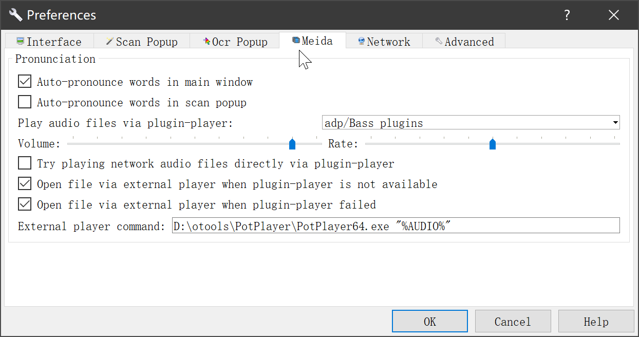 After a new deployment or upgrade to the latest version of GoldenDict++, if audio in articles does not play (it will indicate that the audio engine is not available or something about that), please go to the Preferences‘ Media page and re-pick an engine: